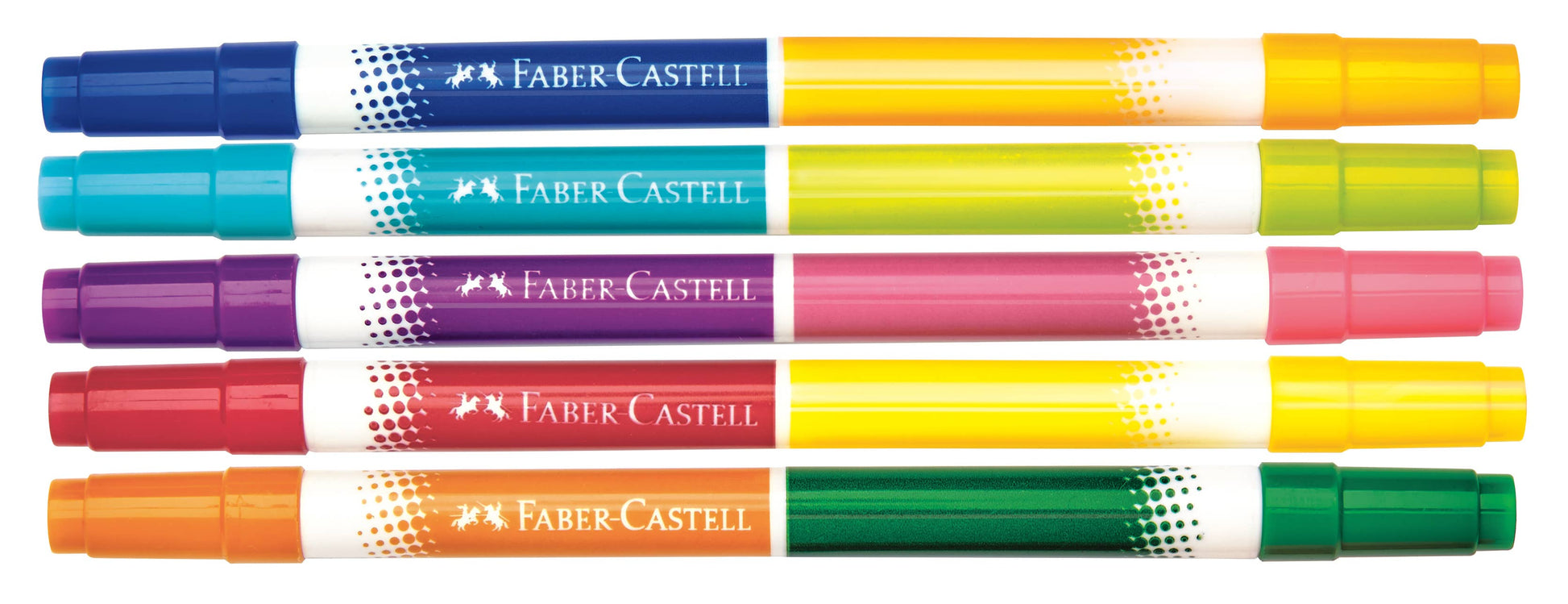 The brightly colored Faber-Castell duo tip markers have a ventilated safety cap to prevent choking. The water-based inks wash out of most fabrics. The pen tips allow you to achieve 2 line widths: thin and broad.